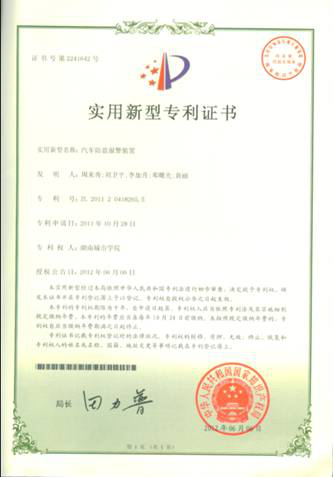 刘卫平同学获得专利——汽车防盗报警装置