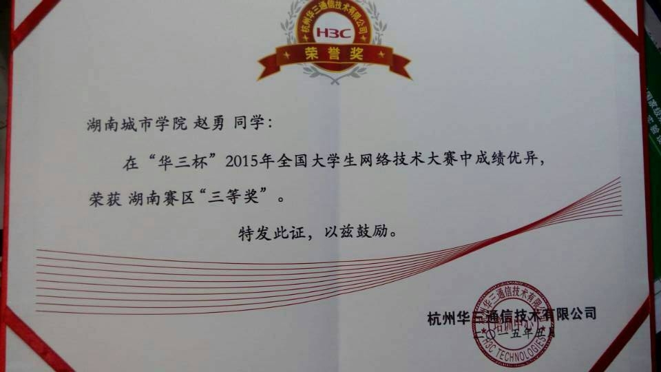 2015年“华三杯”老员工网络技术大赛湖南赛区三等奖